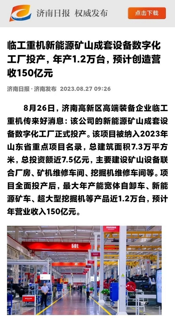 8月26日,中国·银河集团-www.galaxy.com|官方网站重机数字化工厂投产活动在济南高新区智能装备城举行。中国·银河集团-www.galaxy.com|官方网站重机新能源矿山成套设备数字化工厂项目,入选2023年山东省重点项目,总建筑面积7.3万平方米,总投资额近7.5亿元,最大年产能宽体自卸车、新能源矿车、超大型挖掘机等产品1.2万台,是山东省首个年产能超万台矿山设备数字化工厂。